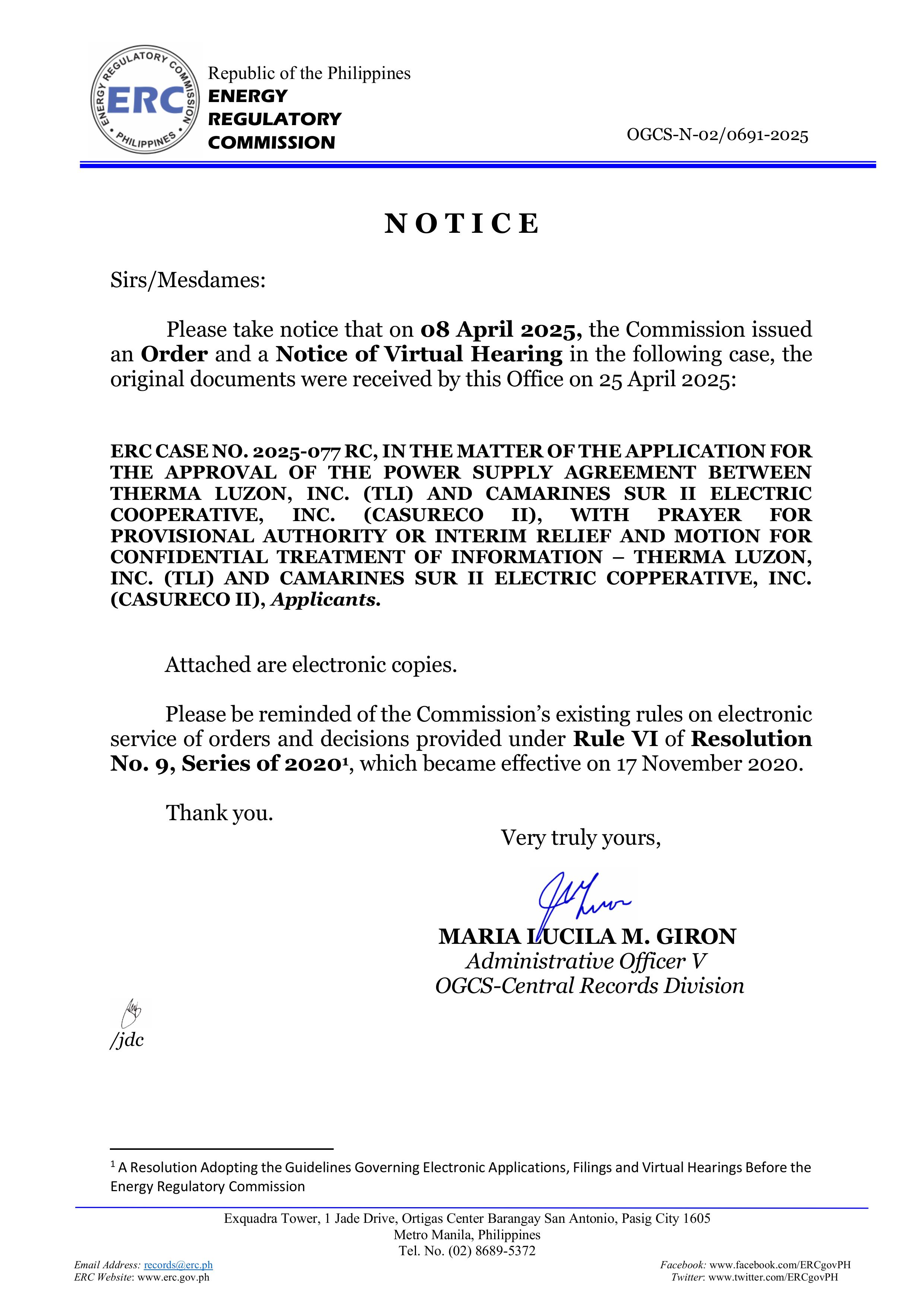 NOTICE OF VIRTUAL HEARING ON ERC CASE NO. 2025-077 RC